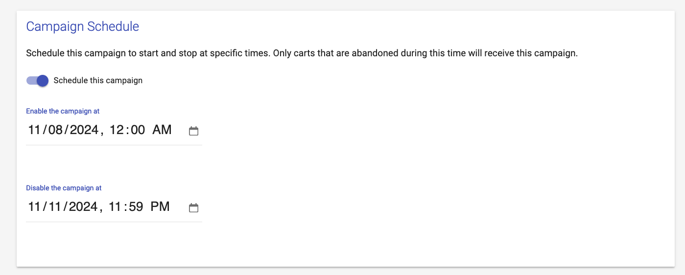 A scheduled campaign is setup under your Abandoned Cart campaigns. You create a new campaign to be scheduled, and then set dates when it's available. When the Start Date begins, the campaign becomes Active and will send to eligible carts. When the End Date finishes, the campaign automatically disables and stops sending emails to anyone who was previously eligible to receive it.