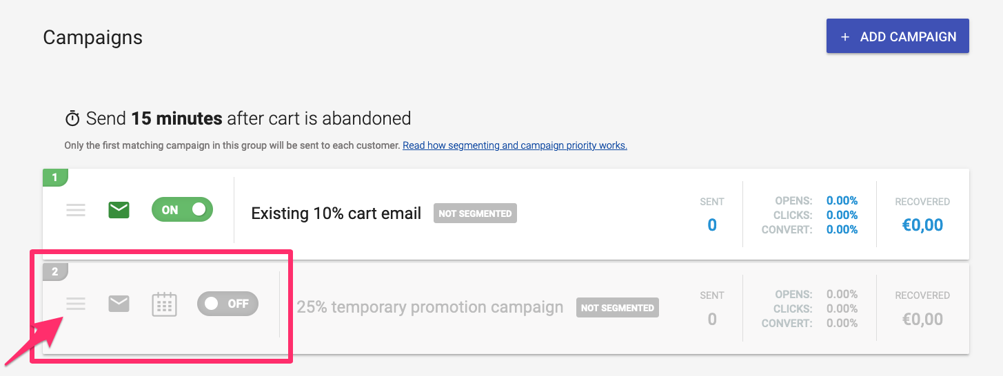 - Use the drag handle on the left and pull the campaign above the existing campaign: