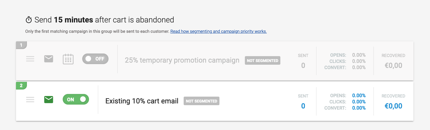 - Now return to your Campaign List screen for Abandoned Carts. You should see something like this: